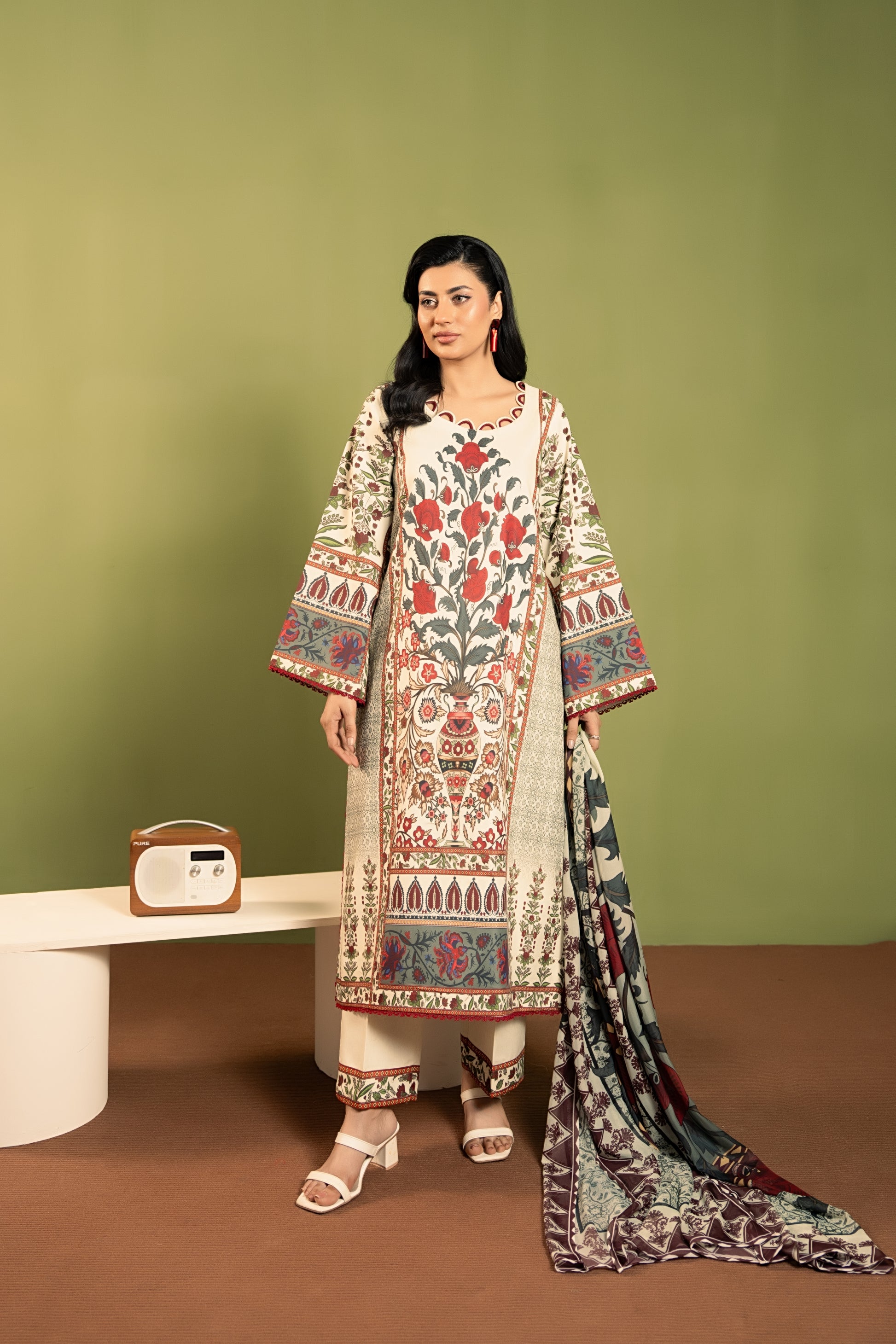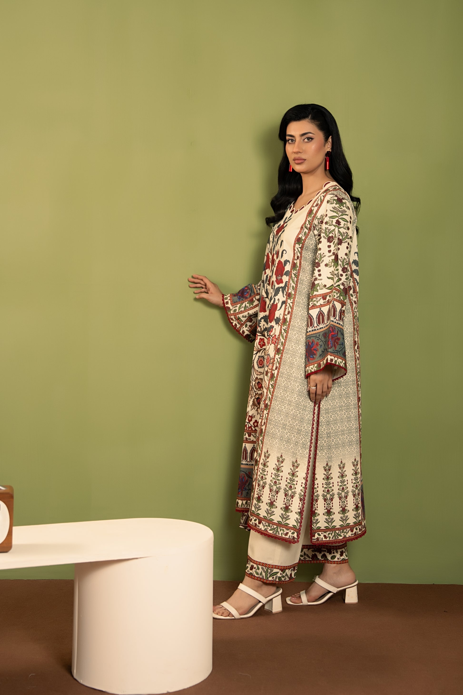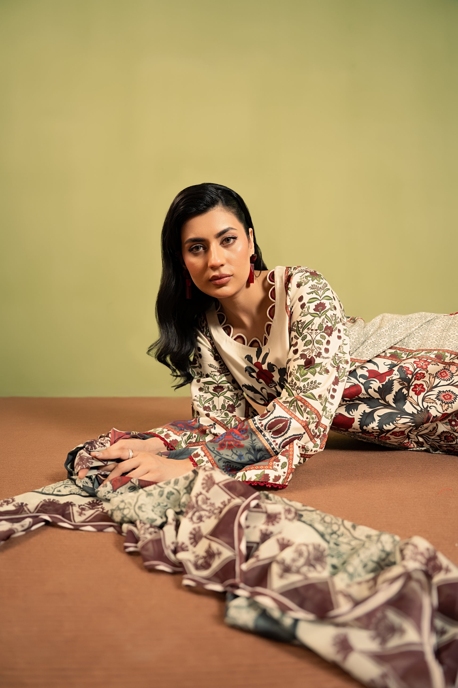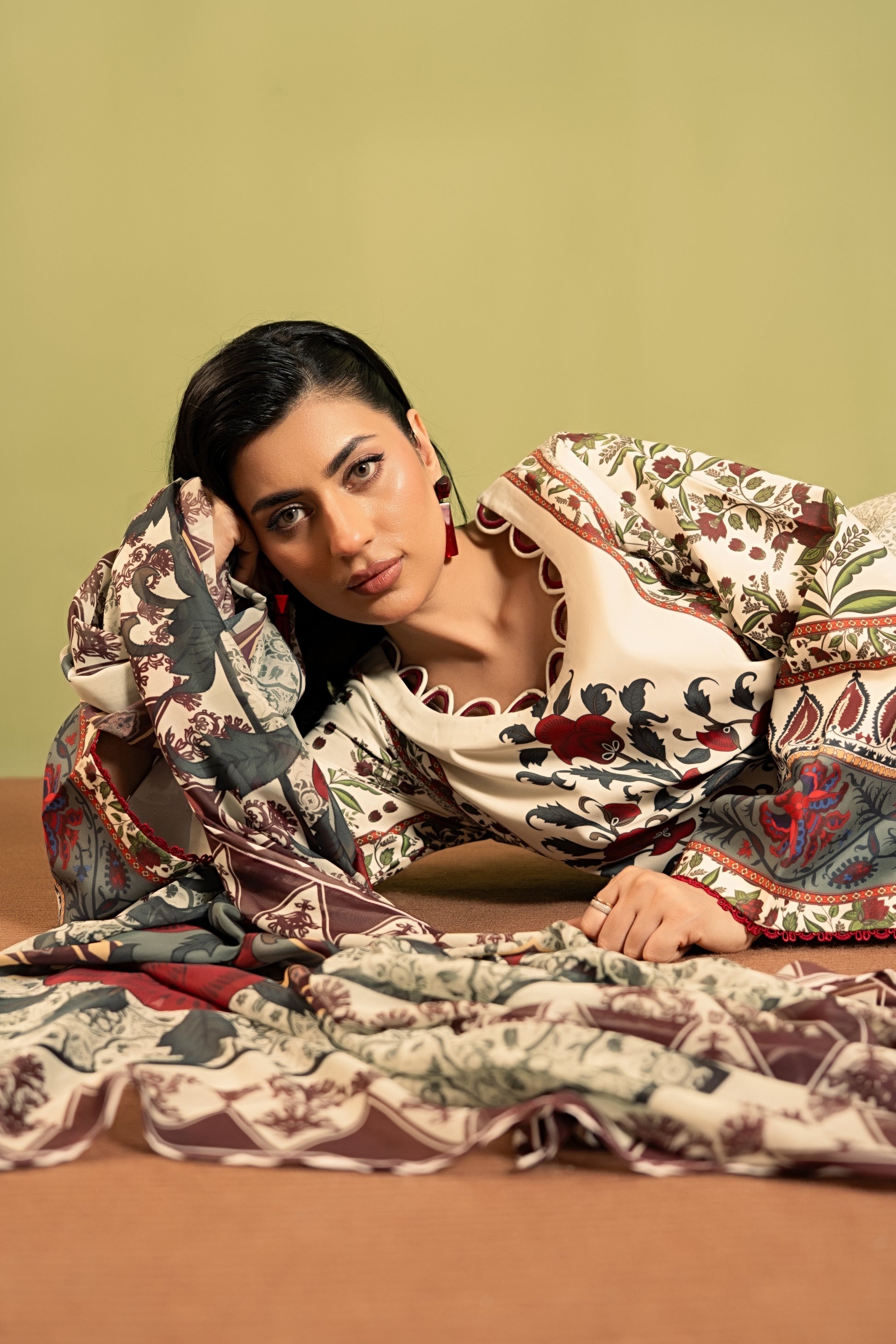 Celebrate classic elegance with this exquisite three-piece printed suit featuring an ivory base enriched with deep crimson and earthy floral motifs. The shirt is beautifully highlighted with an intricately scalloped neckline and artistic botanical patterns, reflecting timeless craftsmanship and cultural heritage.