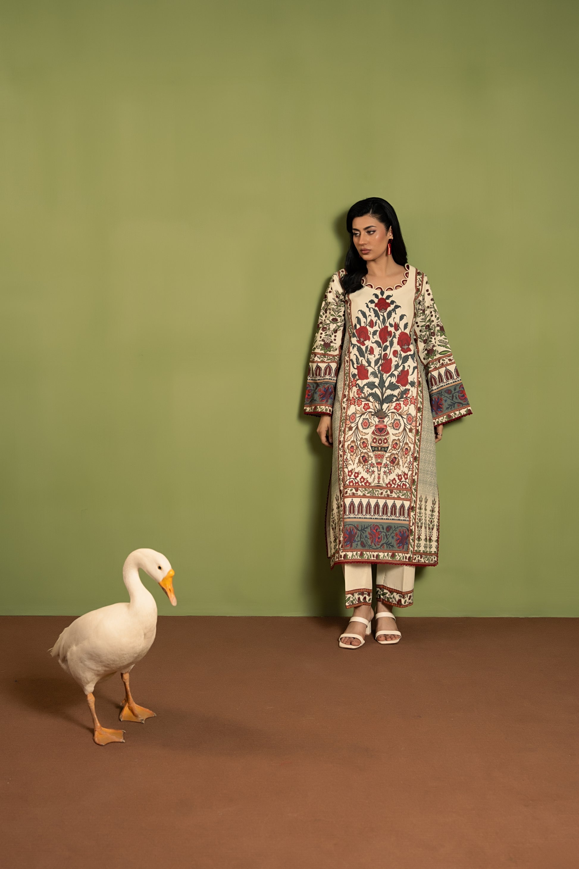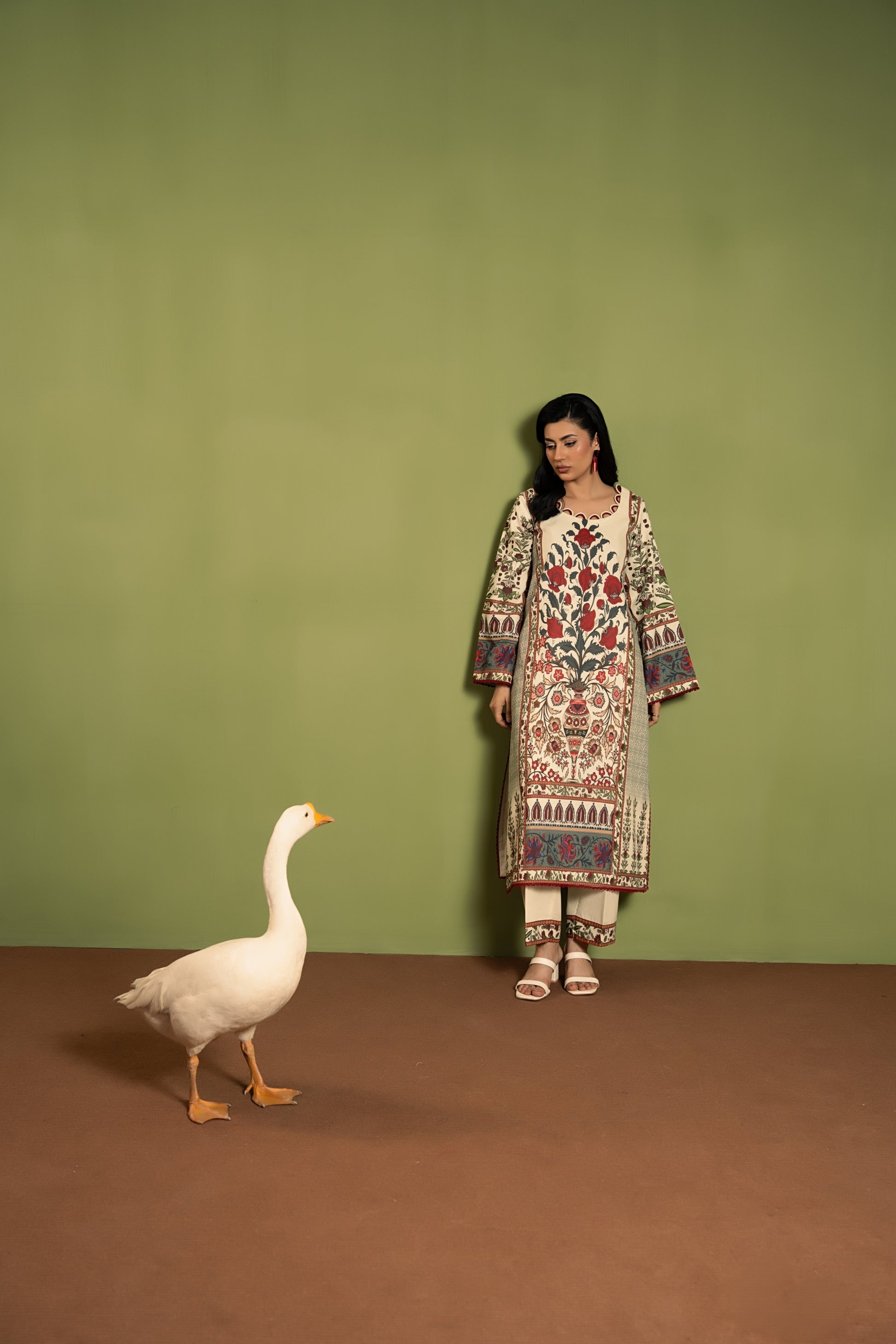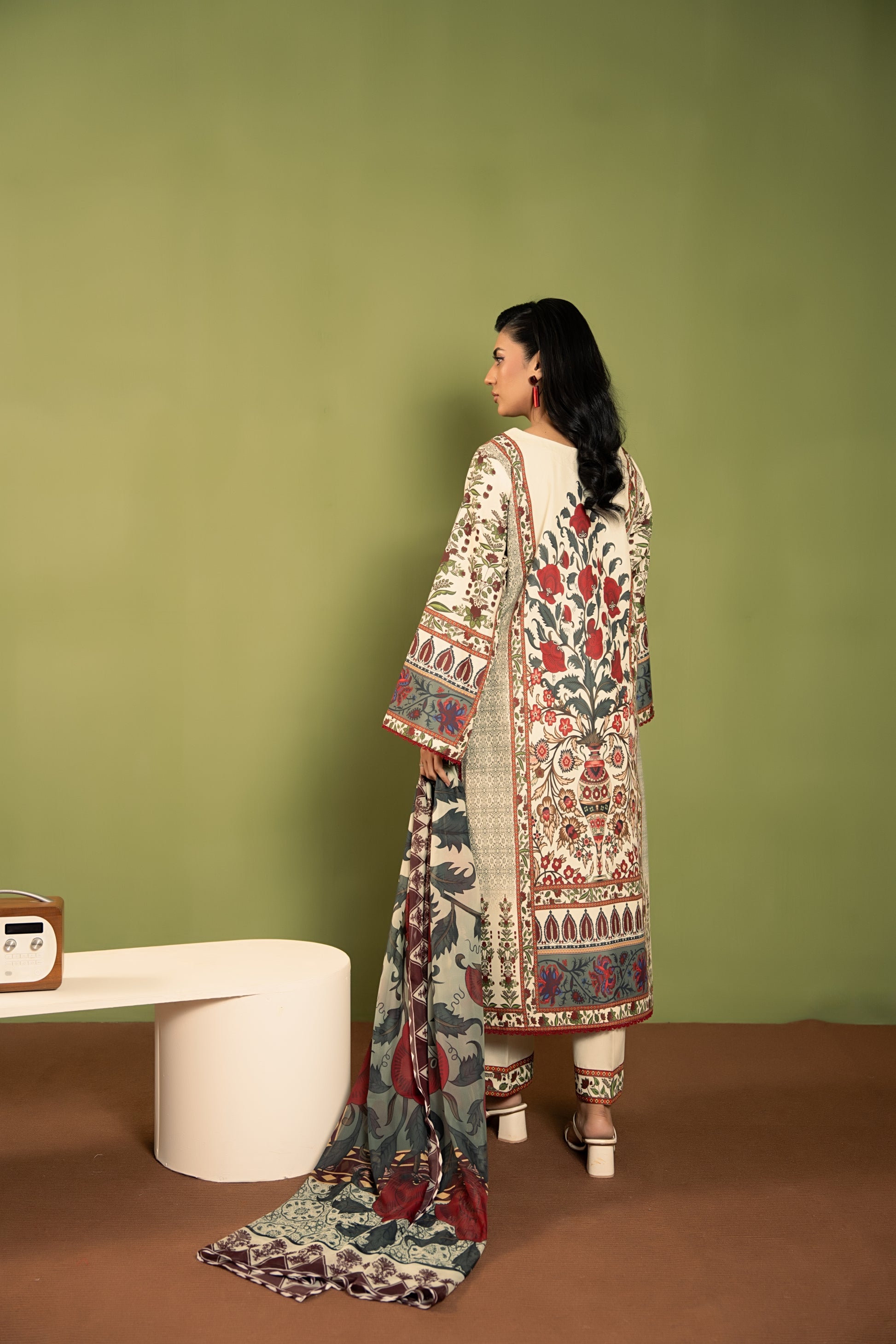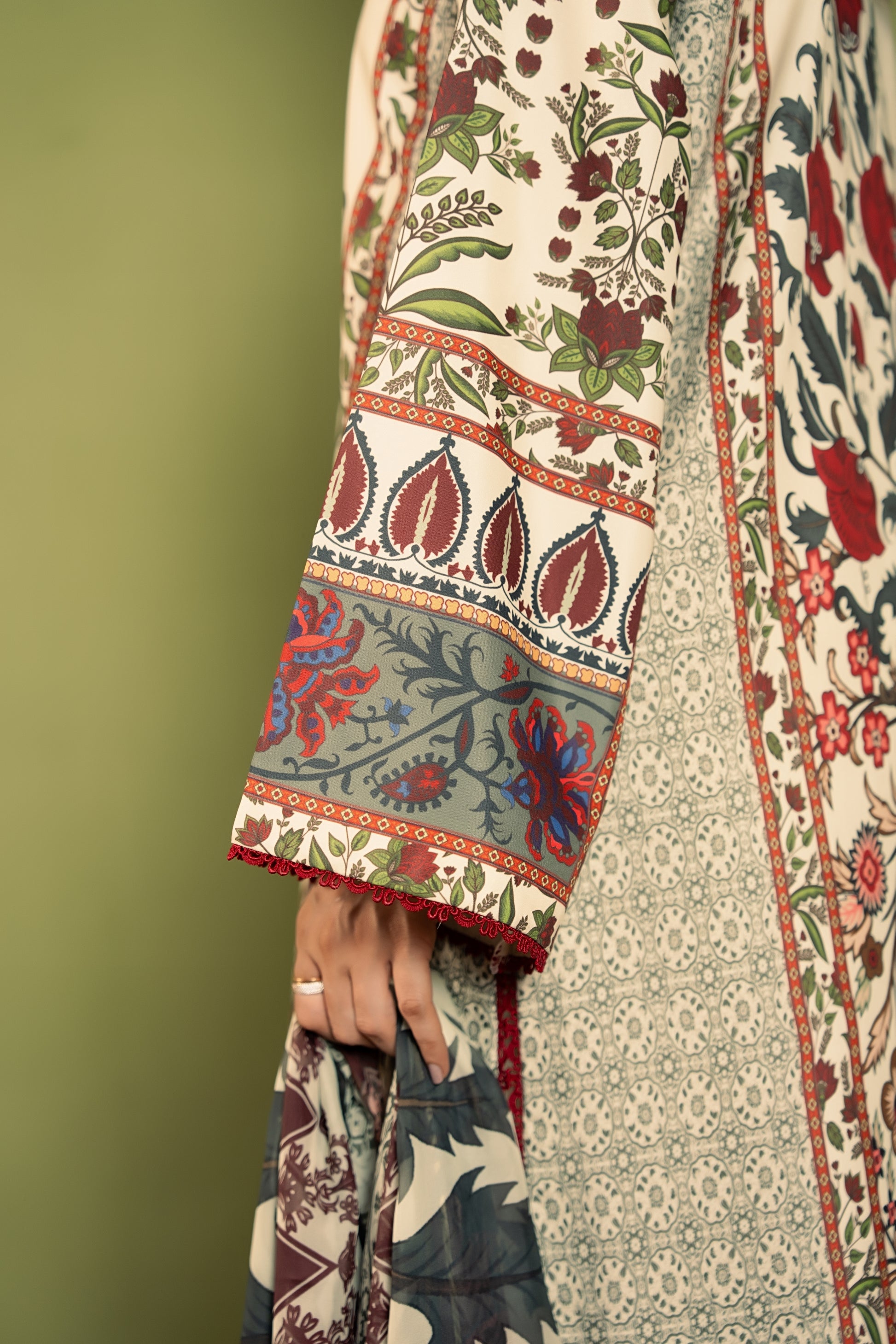 Celebrate classic elegance with this exquisite three-piece printed suit featuring an ivory base enriched with deep crimson and earthy floral motifs. The shirt is beautifully highlighted with an intricately scalloped neckline and artistic botanical patterns, reflecting timeless craftsmanship and cultural heritage.